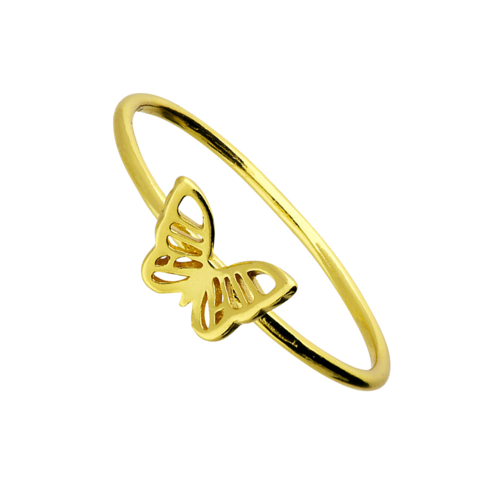 Yellow gold plated cut out butterfly in 925 sterling silver ring. Navya London includes a variety of designs from everlasting classic pieces to those with a modern day twist. Our 9ct gold allows for comfortable wear, especially for those with sensitive skin. Our gold products are created by applying traditional processes to contemporary designs inspiration from around the world, ensuring high quality craftsmanship and materials without losing the edge. A perfect gift for yourself or that special person in your life. Your jewel is presented in a beautiful gift box.