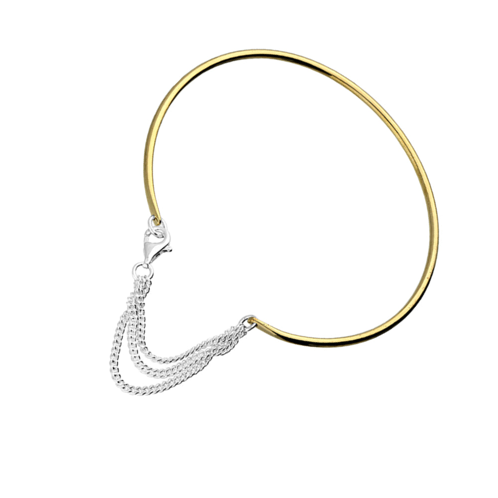 Two tone with cuff yellow gold plated cuff with a silver graduated chain in 925 sterling silver bangle. Navya London includes a variety of designs from everlasting classic pieces to those with a modern day twist. Our 925 sterling silver allows for comfortable wear, especially for those with sensitive skin. Our silver products are created by applying traditional processes to contemporary designs inspiration from around the world, ensuring high quality craftsmanship and materials without losing the edge. A perfect gift for yourself or that special person in your life. Your jewel is presented in a beautiful gift box.