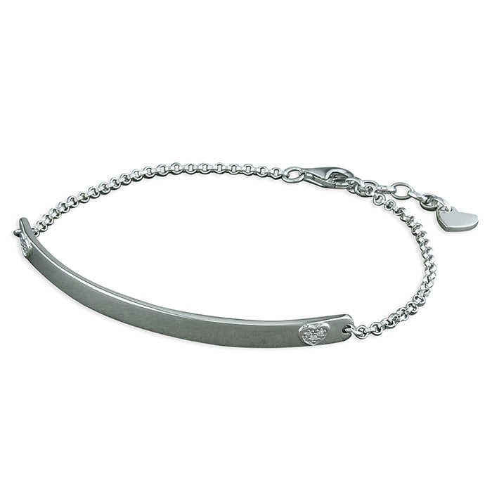 Rhodium plated cubic zirconia heart ID sterling silver bracelets. Navya London includes a variety of designs from everlasting classic pieces to those with a modern day twist. Our 925 sterling silver allows for comfortable wear, especially for those with sensitive skin. Our silver products are created by applying traditional processes to contemporary designs inspiration from around the world, ensuring high quality craftsmanship and materials without losing the edge. A perfect gift for yourself or that special person in your life. Your jewel is presented in a beautiful gift box.