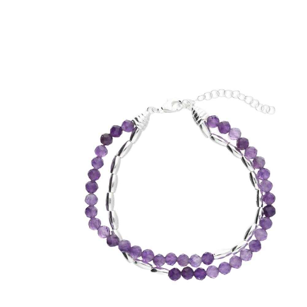 Yellow gold plated double row seed chain and natural amethyst with a 17cm to 20cm extender in 925 sterling silver bracelets.. Navya London includes a variety of designs from everlasting classic pieces to those with a modern day twist. Our 925 sterling silver allows for comfortable wear, especially for those with sensitive skin. Our silver products are created by applying traditional processes to contemporary designs inspiration from around the world, ensuring high quality craftsmanship and materials without losing the edge. A perfect gift for yourself or that special person in your life. Your jewel is presented in a beautiful gift box.