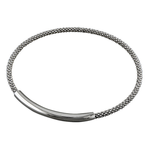 Rhodium plated popcorn with ID plate sterling silver bangle. Navya London includes a variety of designs from everlasting classic pieces to those with a modern day twist. Our 925 sterling silver allows for comfortable wear, especially for those with sensitive skin. Our silver products are created by applying traditional processes to contemporary designs inspiration from around the world, ensuring high quality craftsmanship and materials without losing the edge. A perfect gift for yourself or that special person in your life. Your jewel is presented in a beautiful gift box.