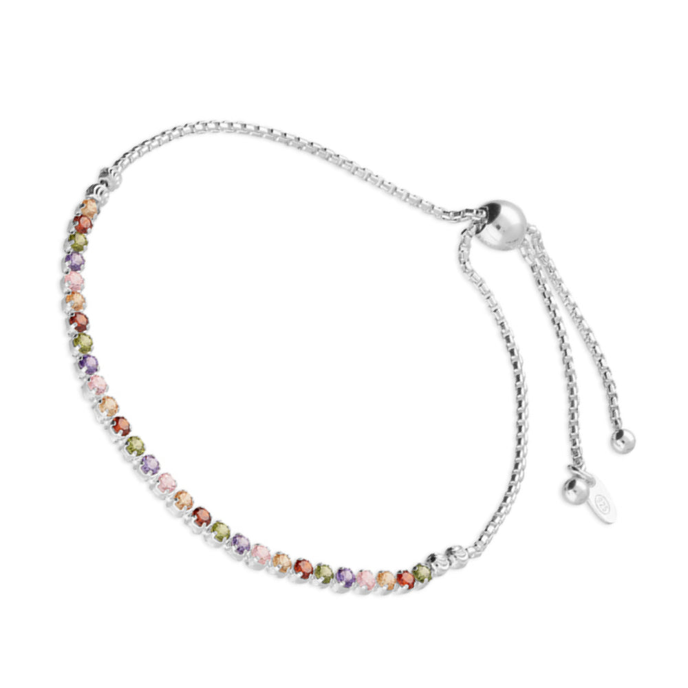 Pretty 24cm long multi coloured cubic zirconia rainbow slider with beads in 925 sterling silver bracelet. Navya London includes a variety of designs from everlasting classic pieces to those with a modern day twist. Our 925 sterling silver allows for comfortable wear, especially for those with sensitive skin. Our silver products are created by applying traditional processes to contemporary designs inspiration from around the world, ensuring high quality craftsmanship and materials without losing the edge. A perfect gift for yourself or that special person in your life. Your jewel is presented in a beautiful gift box.