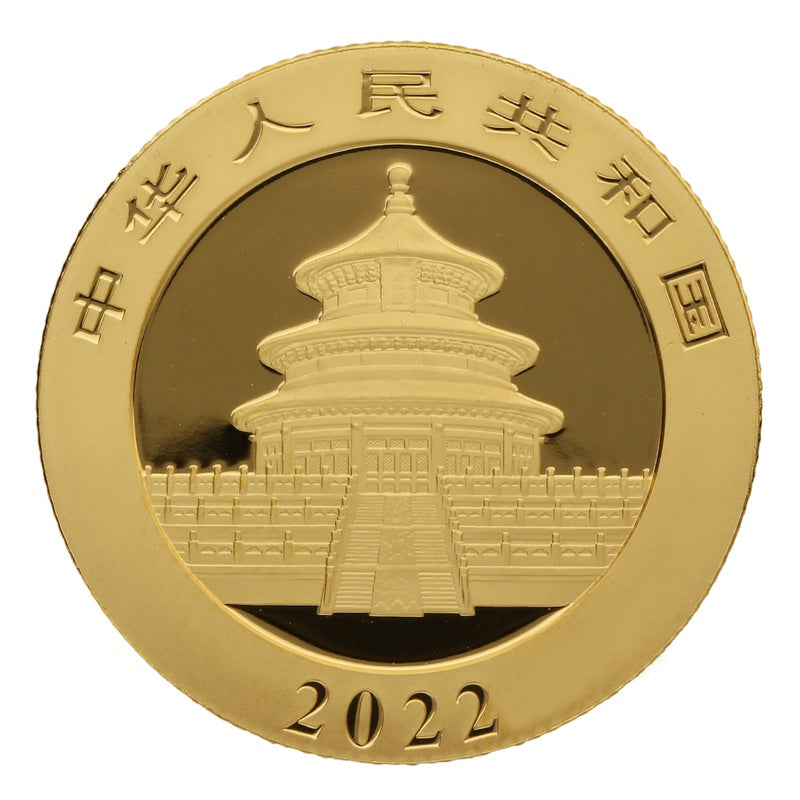 2022 1g Gold Chinese Panda Coin. A one gram 2022 Chinese Panda gold coin with a face value of 10 Yuan. This is the smallest denomination of Panda coin, and one of the smallest gold coins available to investors, making the 1g 2022 Panda coin a great choice for a gift, or budget-conscious investor.