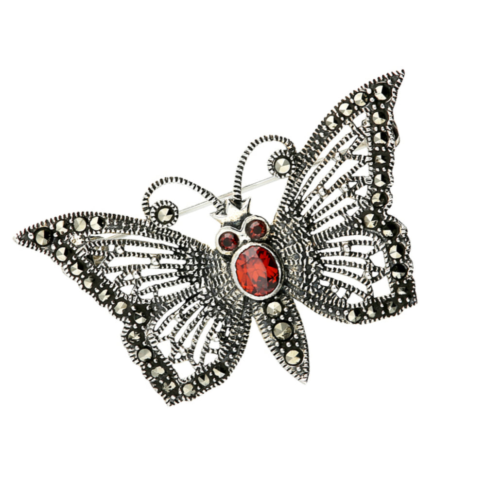 Marcasite butterfly with garnet body in 925 sterling silver brooch. Navya London isn’t just jewellery it’s a statement. From timeless classics to modern silhouettes with an edge, our pieces are designed for those who don’t follow trends they set them.