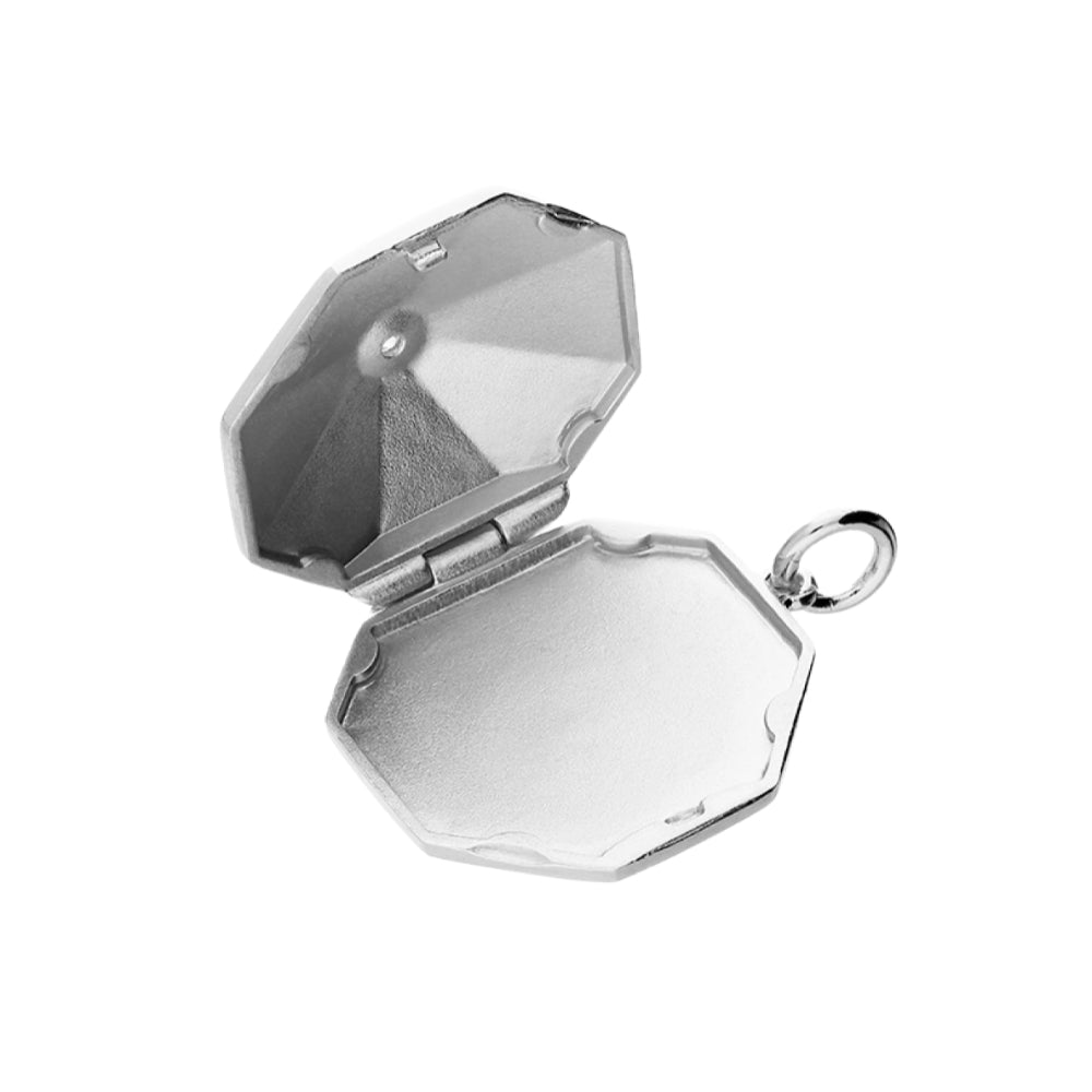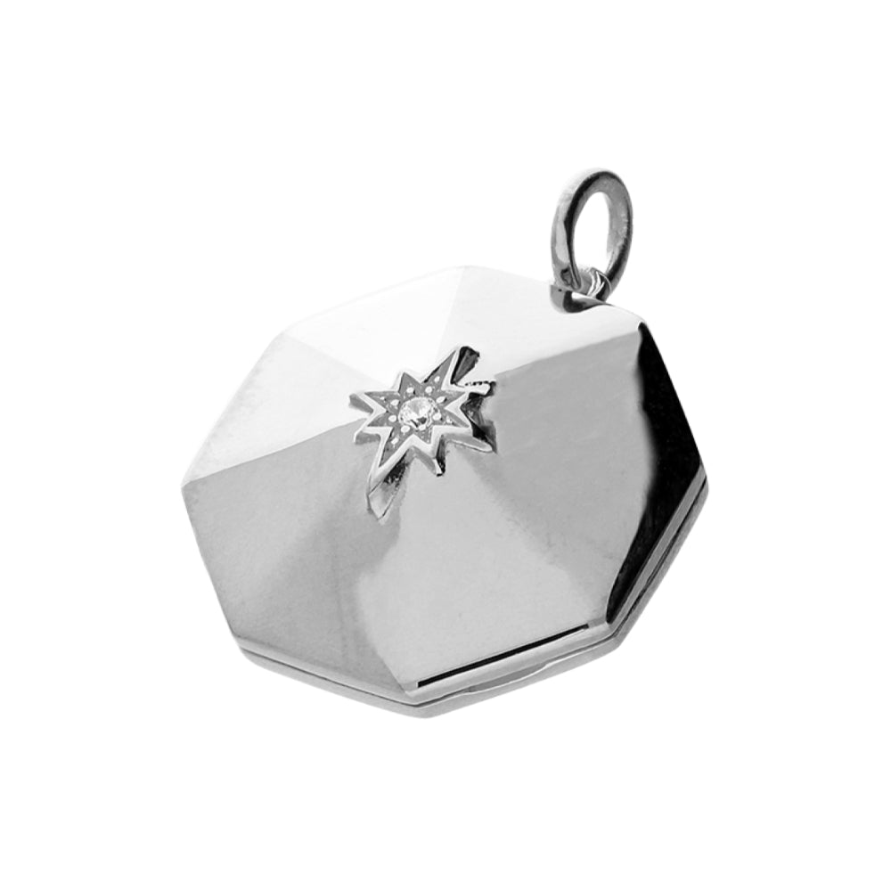 Octagonal dome with a cubic zirconia star centre locket in 925 sterling silver. Navya London includes a variety of designs from everlasting classic pieces to those with a modern day twist. Our 925 sterling silver allows for comfortable wear, especially for those with sensitive skin. Our silver products are created by applying traditional processes to contemporary designs inspiration from around the world, ensuring high quality craftsmanship and materials without losing the edge. A perfect gift for yourself or that special person in your life. Your jewel is presented in a beautiful gift box.