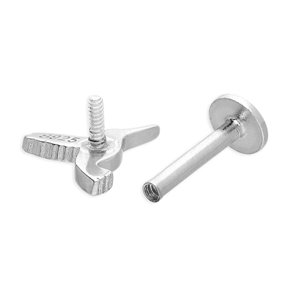 Rhodium plated single hummingbird earring with labret stud. Labret studs were originally designed for use in lip piercing, but this is now a term commonly applied to studs used for a variety of ear piercings, from earlobes to conch and upper ear piercings. Our studs are designed to be worn in the ear. They function in the same way as a butterfly back but are 'threaded' and screw-in which makes them very secure. In this style the front unscrews rather than the back. Not recommended for new piercings in 925 sterling silver earrings.