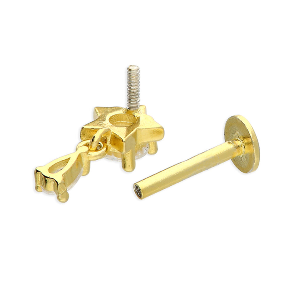 Single yellow gold plated earring cubic zirconia star stud with cubic zirconia drop charm labret. Labret studs were originally designed for use in lip piercing, but this is now a term commonly applied to studs used for a variety of ear piercings, from earlobes to conch and upper ear piercings. Our studs are designed to be worn in the ear. They function in the same way as a butterfly back but are 'threaded' and screw-in which makes them very secure. In this style the front unscrews rather than the back. Not recommended for new piercings in 925 sterling silver earrings.
