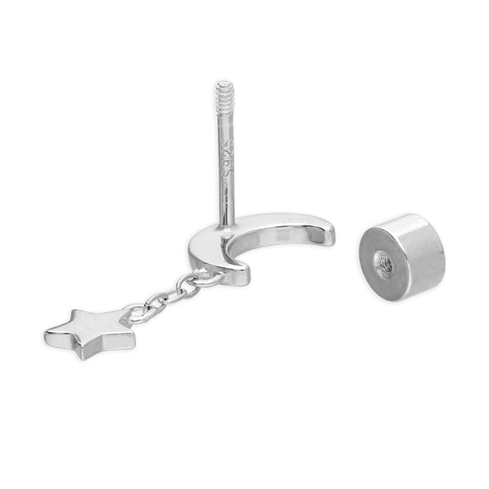 Single rhodium plated labret stud with star drop. Abret studs were originally designed for use in lip piercing, but this is now a term now also commonly applied to studs used for a variety of ear piercings, from earlobes to conch and upper ear piercings. Our studs are designed to be worn in the ear. They function in the same way as a butterfly back but are 'threaded' and screw-in which makes them very secure. Not recommended for new piercings in 925 sterling silver earrings.