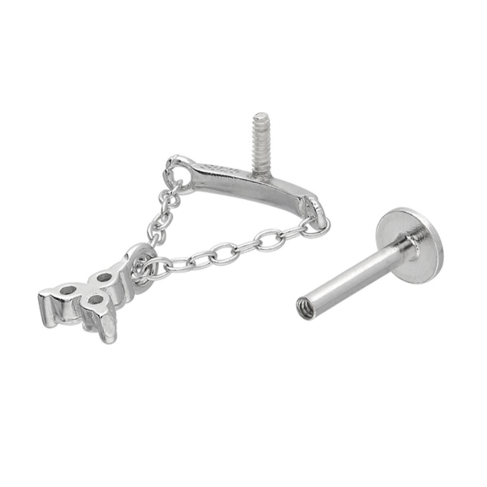 Single rhodium plated labret stud with 3 cubic zirconia hanging charm. Labret studs were originally designed for use in lip piercing, but this is now a term commonly applied to studs used for a variety of ear piercings, from earlobes to conch and upper ear piercings. Our studs are designed to be worn in the ear. They function in the same way as a butterfly back but are 'threaded' and screw-in which makes them very secure. In this style the front unscrews rather than the back. Not recommended for new piercings in 925 sterling silver earrings.