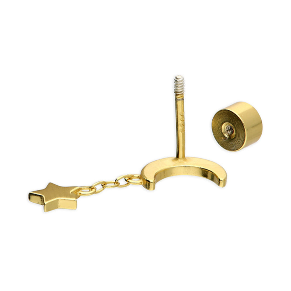 Single yellow gold plated labret stud with a star drop. Labret studs were originally designed for use in lip piercing, but this is now a term now also commonly applied to studs used for a variety of ear piercings, from earlobes to conch and upper ear piercings. Our studs are designed to be worn in the ear. They function in the same way as a butterfly back but are 'threaded' and screw-in which makes them very secure not recommended for new piercings in 925 sterling silver earrings.