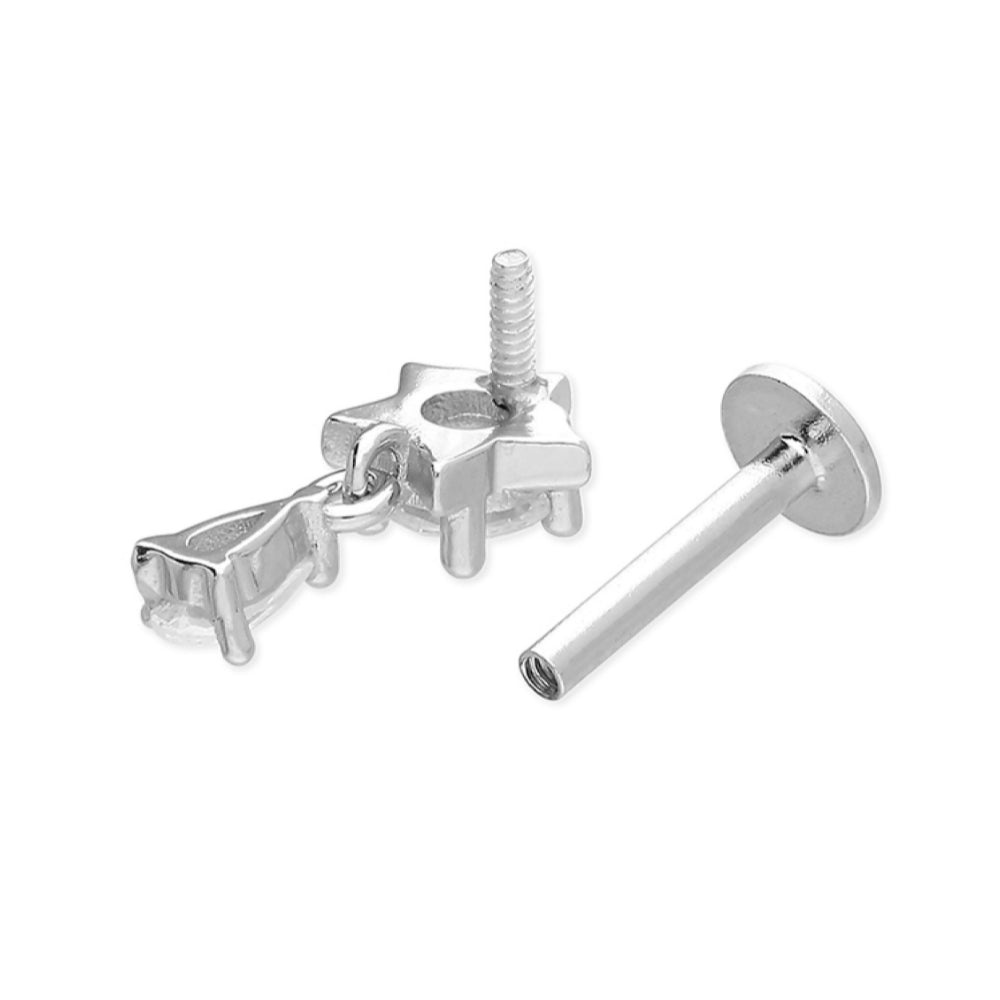Single rhodium plated earring cubic zirconia star stud with cubic zirconia drop charm labret stud. Labret studs were originally designed for use in lip piercing, but this is now a term commonly applied to studs used for a variety of ear piercings, from earlobes to conch and upper ear piercings. Our studs are designed to be worn in the ear. They function in the same way as a butterfly back but are 'threaded' and screw-in which makes them very secure. In this style the front unscrews rather than the back. Not recommended for new piercings in 925 sterling silver earrings.
