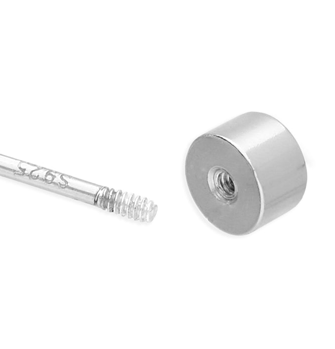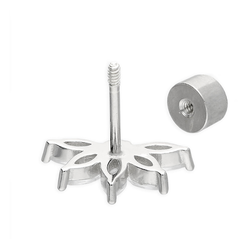 Single rhodium plated labret stud with a half cubic zirconia flower. Abret studs were originally designed for use in lip piercing, but this is now a term now also commonly applied to studs used for a variety of ear piercings, from earlobes to conch and upper ear piercings. Our studs are designed to be worn in the ear. They function in the same way as a butterfly back but are 'threaded' and screw-in which makes them very secure. Not recommended for new piercings in 925 sterling silver earrings.