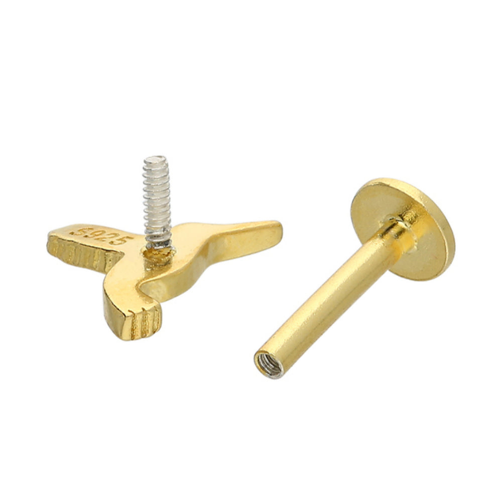 Yellow gold plated single hummingbird earring with labret stud. Labret studs were originally designed for use in lip piercing, but this is now a term commonly applied to studs used for a variety of ear piercings, from earlobes to conch and upper ear piercings. Our studs are designed to be worn in the ear. They function in the same way as a butterfly back but are 'threaded' and screw-in which makes them very secure. In this style the front unscrews rather than the back. Not recommended for new piercings in 925 sterling silver earring.