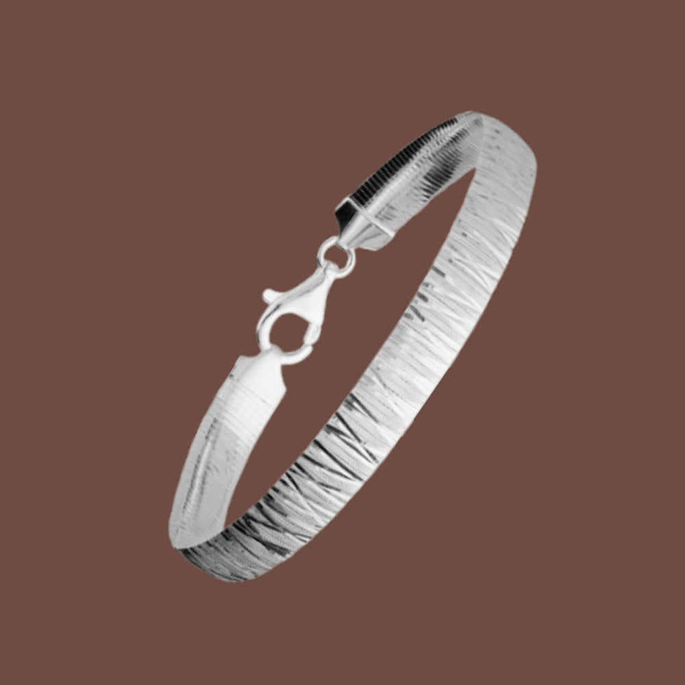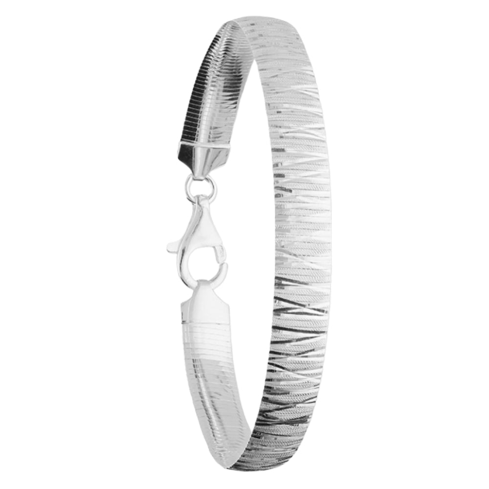 19cm or 7.5 inch diamond cut design. This piece showcases a textured linear design that adds depth and dimension, whilst the diamond cutting creates drama, giving the piece a sparkling, almost shimmering effect as it moves. Perfect for celebration collections, bridal and parties in 925 sterling silver bracelet.