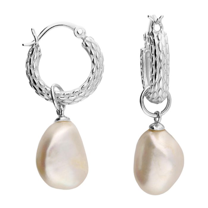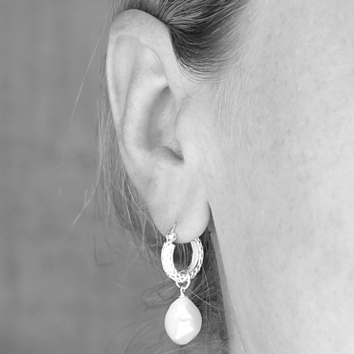 Basket weave hoop with a freshwater pearl charm in 925 sterling silver earring. Navya London includes a variety of designs from everlasting classic pieces to those with a modern day twist. Our 925 sterling silver allows for comfortable wear, especially for those with sensitive skin. Our silver products are created by applying traditional processes to contemporary designs inspiration from around the world, ensuring high quality craftsmanship and materials without losing the edge. A perfect gift for yourself or that special person in your life. Your jewel is presented in a beautiful gift box.