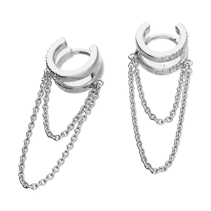 10mm cubic zirconia double hoop hinged huggie with hanging chains. Navya London includes a variety of designs from everlasting classic pieces to those with a modern day twist. Our 925 sterling silver allows for comfortable wear, especially for those with sensitive skin. Our silver products are created by applying traditional processes to contemporary designs inspiration from around the world, ensuring high quality craftsmanship and materials without losing the edge. A perfect gift for yourself or that special person in your life. Your jewel is presented in a beautiful gift box.