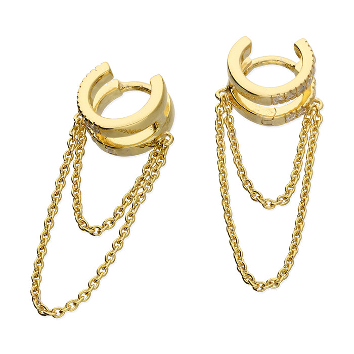 Cubic Zirconia Double Hoop Hinged Huggie with Hanging Chains