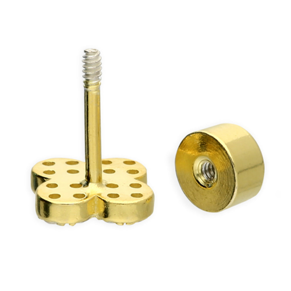Single yellow gold plated earring, cubic zirconia quatrefoil. Labret studs were originally designed for use in lip piercing, but this is now a term now also commonly applied to studs used for a variety of ear piercings, from earlobes to conch and upper ear piercings. Our studs are designed to be worn in the ear. They function in the same way as a butterfly back but are 'threaded' and screw-in which makes them very secure. Not recommended for new piercings in 925 sterling silver earrings.