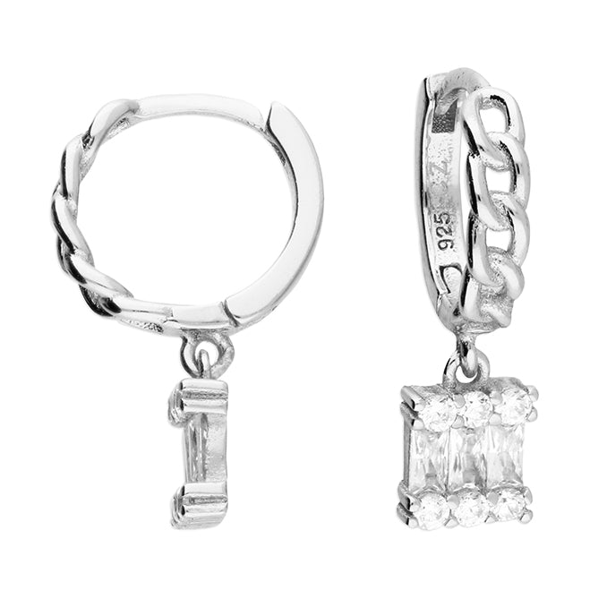 Cubic zirconia trio bar and round on half chain link huggie hoop in sterling silver earrings. Navya London includes a variety of designs from everlasting classic pieces to those with a modern day twist. Our 925 sterling silver allows for comfortable wear, especially for those with sensitive skin. Our silver products are created by applying traditional processes to contemporary designs inspiration from around the world, ensuring high quality craftsmanship and materials without losing the edge. A perfect gift for yourself or that special person in your life. Your jewel is presented in a beautiful gift box.