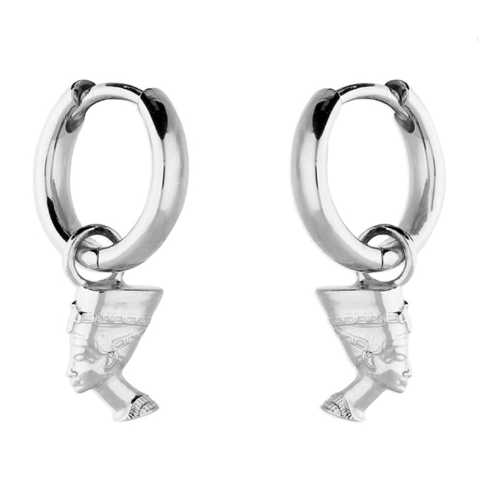 Nefertiti on 13mm huggie hoop in sterling silver. Navya London includes a variety of designs from everlasting classic pieces to those with a modern day twist. Our 925 sterling silver allows for comfortable wear, especially for those with sensitive skin. Our silver products are created by applying traditional processes to contemporary designs inspiration from around the world, ensuring high quality craftsmanship and materials without losing the edge. A perfect gift for yourself or that special person in your life. Your jewel is presented in a beautiful gift box.