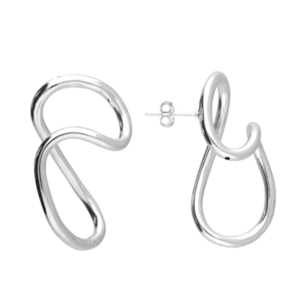 Large earrings showcase, freeform shape with flowing, curved lines resembling an artistic interpretation of loops or waves. This earring is electro formed, therefore has two venting holes in 925 sterling silver earrings.
