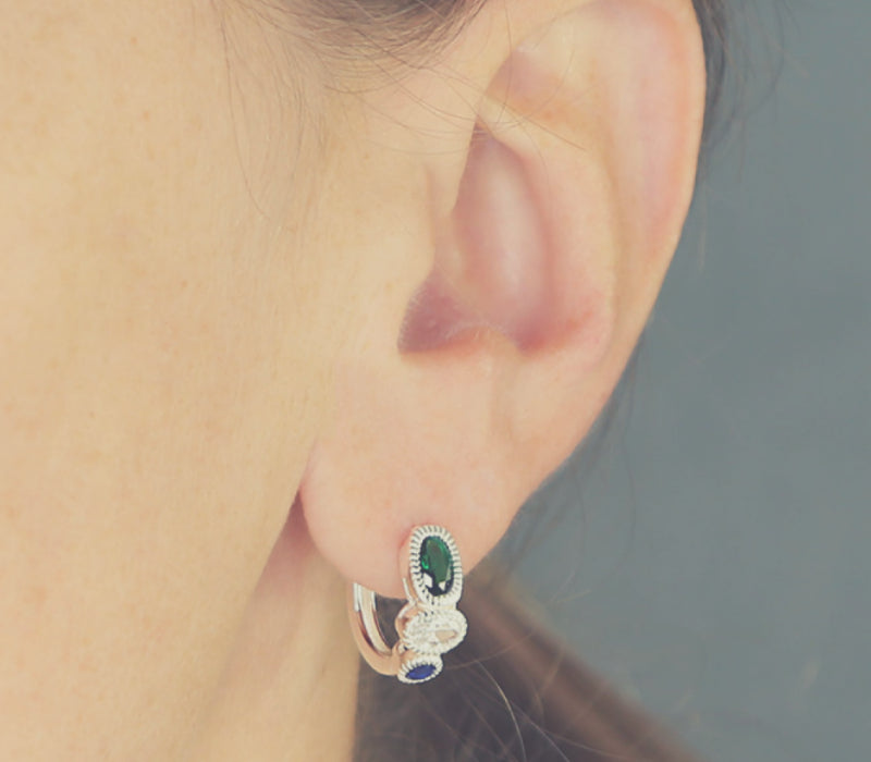 Three colour stone set huggie in 925 sterling silver earrings. Navya London includes a variety of designs from everlasting classic pieces to those with a modern day twist. Our 9ct, 925 sterling silver allows for comfortable wear, especially for those with sensitive skin. Our silver products are created by applying traditional processes to contemporary designs inspiration from around the world, ensuring high quality craftsmanship and materials without losing the edge. A perfect gift for yourself or that special person in your life. Your jewel is presented in a beautiful gift box.