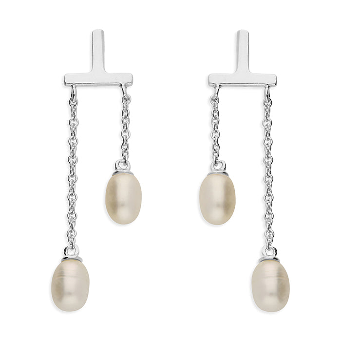Upside down T stud with two asymmetric length, chain and freshwater pearl drop sterling silver earrings. Navya London includes a variety of designs from everlasting classic pieces to those with a modern day twist. Our 925 sterling silver allows for comfortable wear, especially for those with sensitive skin. Our silver products are created by applying traditional processes to contemporary designs inspiration from around the world, ensuring high quality craftsmanship and materials without losing the edge. A perfect gift for yourself or that special person in your life. Your jewel is presented in a beautiful gift box.