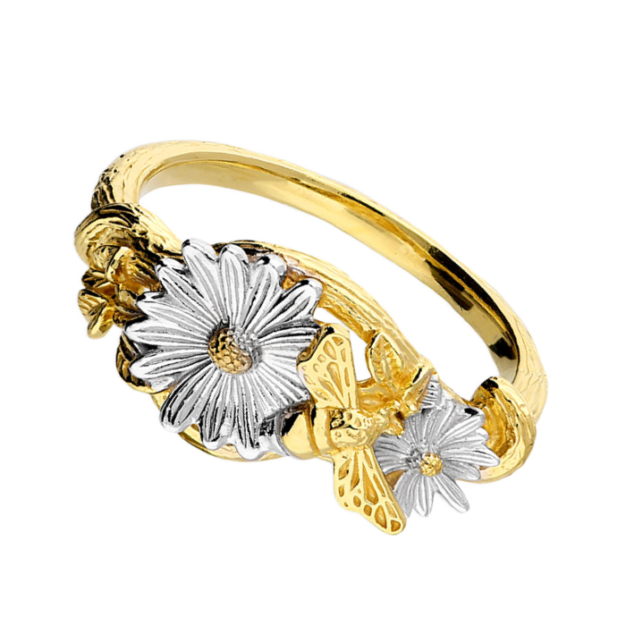 Two tone daisy and bee detailing on a yellow gold plated textured band in 925 sterling silver. Navya London includes a variety of designs from everlasting classic pieces to those with a modern day twist. Our 925 sterling silver allows for comfortable wear, especially for those with sensitive skin. Our silver products are created by applying traditional processes to contemporary designs inspiration from around the world, ensuring high quality craftsmanship and materials without losing the edge. A perfect gift for yourself or that special person in your life. Your jewel is presented in a beautiful gift box.