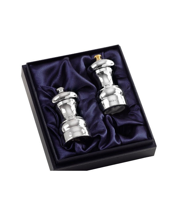 4 inch tall pair of salt & pepper mills with sterling silver comes with cases. Navya London includes a variety of designs from everlasting classic pieces to those with a modern day twist. Our 925 sterling silver allows for comfortable wear, especially for those with sensitive skin. Our silver products are created by applying traditional processes to contemporary designs inspiration from around the world, ensuring high quality craftsmanship and materials without losing the edge. A perfect gift for yourself or that special person in your life. Your gift is presented in a beautiful gift box.