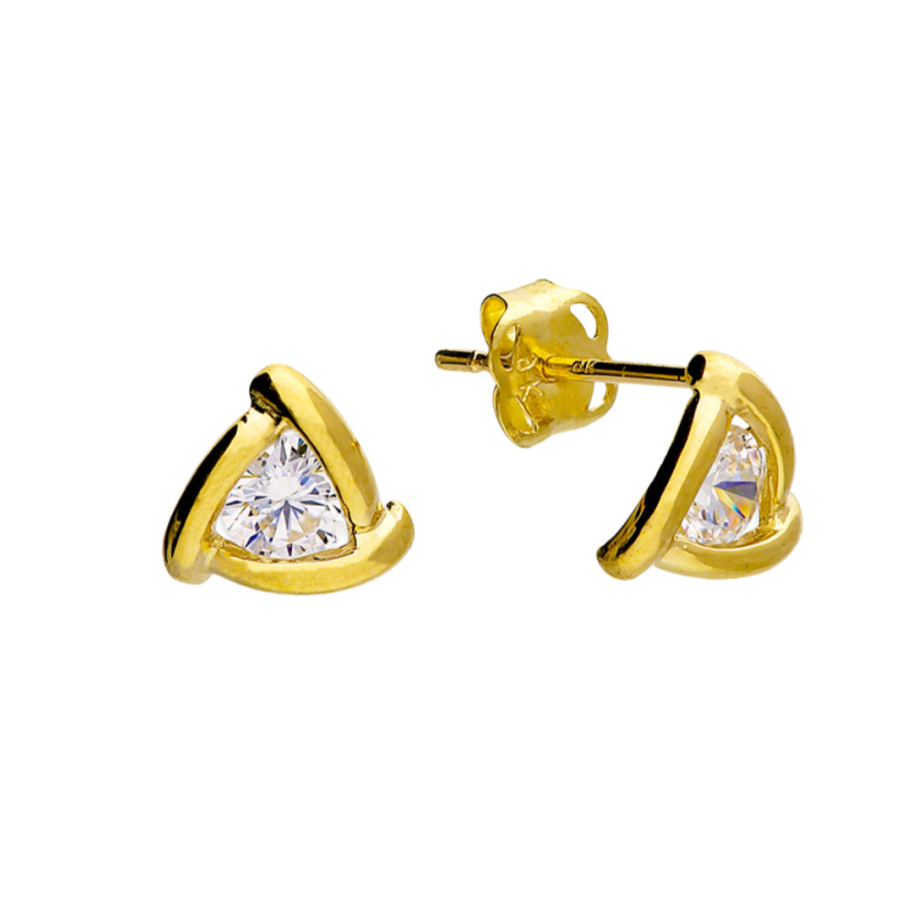 Cubic zirconia in interwoven triangle stud in 9ct gold. Navya London includes a variety of designs from everlasting classic pieces to those with a modern day twist. Our 9ct gold allows for comfortable wear, especially for those with sensitive skin. Our gold products are created by applying traditional processes to contemporary designs inspiration from around the world, ensuring high quality craftsmanship and materials without losing the edge. A perfect gift for yourself or that special person in your life. Your jewel is presented in a beautiful gift box.