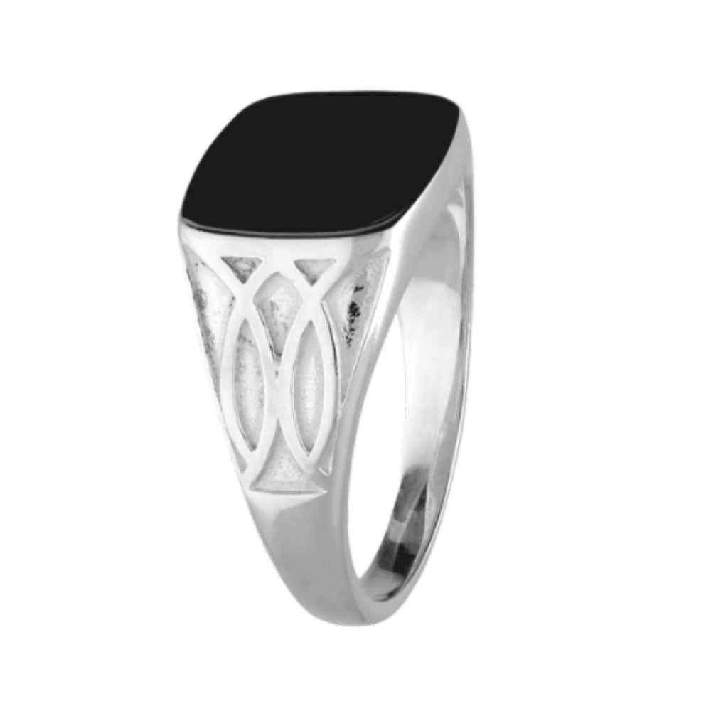 Black enamel men's fancy shoulder signet ring in 925 sterling silver. Navya London includes a variety of designs from everlasting classic pieces to those with a modern day twist. Our 9ct gold allows for comfortable wear, especially for those with sensitive skin. Our gold products are created by applying traditional processes to contemporary designs inspiration from around the world, ensuring high quality craftsmanship and materials without losing the edge. A perfect gift for yourself or that special person in your life. Your jewel is presented in a beautiful gift box.