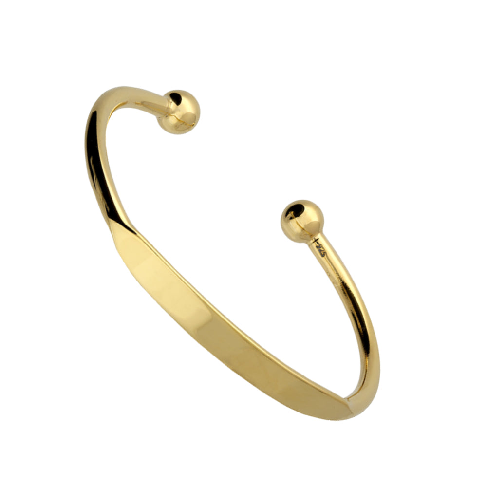 Yellow gold plated solid torc with a flat D shaped ID bar in 925 sterling silver bangle. Navya London includes a variety of designs from everlasting classic pieces to those with a modern day twist. Our 925 sterling silver allows for comfortable wear, especially for those with sensitive skin. Our silver products are created by applying traditional processes to contemporary designs inspiration from around the world, ensuring high quality craftsmanship and materials without losing the edge. A perfect gift for yourself or that special person in your life. Your jewel is presented in a beautiful gift box.