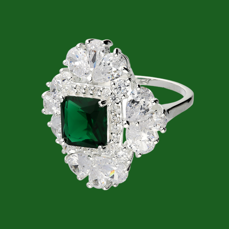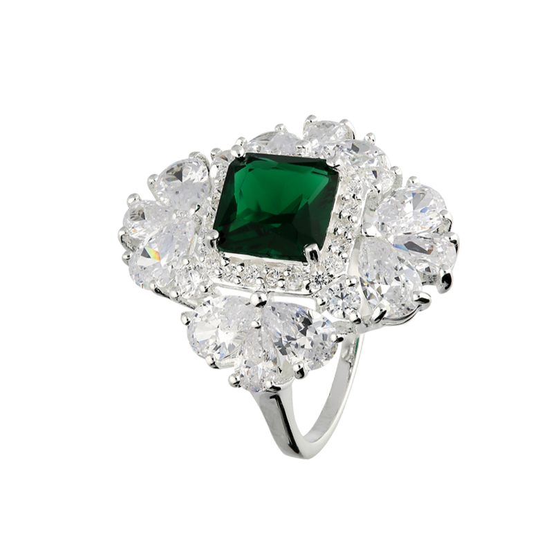 Synthetic emerald square with fancy flower white cubic zirconia edge in sterling silver ring. Navya London includes a variety of designs from everlasting classic pieces to those with a modern day twist. Our 925 sterling silver allows for comfortable wear, especially for those with sensitive skin. Our silver products are created by applying traditional processes to contemporary designs inspiration from around the world, ensuring high quality craftsmanship and materials without losing the edge. A perfect gift for yourself or that special person in your life. Your jewel is presented in a beautiful gift box. Also available in rose gold plated and gold plated sterling silver.