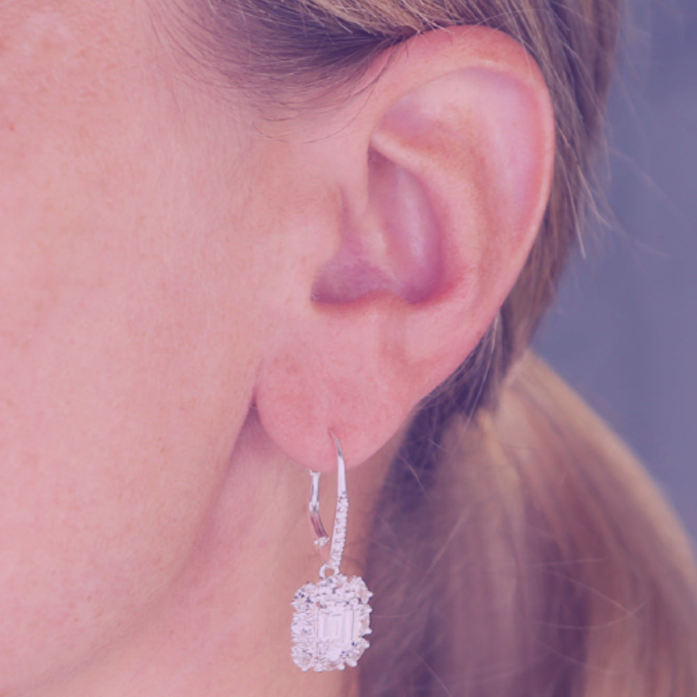 White cubic zirconia empire style baguette fancy halo hook in 925 sterling silver earrings. Navya London includes a variety of designs from everlasting classic pieces to those with a modern day twist. Our 925 sterling silver allows for comfortable wear, especially for those with sensitive skin. Our silver products are created by applying traditional processes to contemporary designs inspiration from around the world, ensuring high quality craftsmanship and materials without losing the edge. A perfect gift for yourself or that special person in your life. Your jewel is presented in a beautiful gift box.