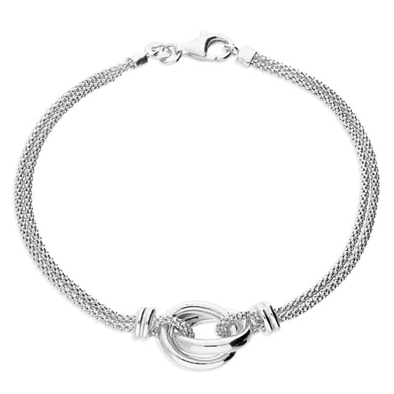 Entwined knotted rings on a double box chain with 17+2.5cm extender in 925 sterling silver bracelets. Navya London includes a variety of designs from everlasting classic pieces to those with a modern day twist. Our 925 sterling silver allows for comfortable wear, especially for those with sensitive skin. Our silver products are created by applying traditional processes to contemporary designs inspiration from around the world, ensuring high quality craftsmanship and materials without losing the edge. A perfect gift for yourself or that special person in your life. Your jewel is presented in a beautiful gift box.