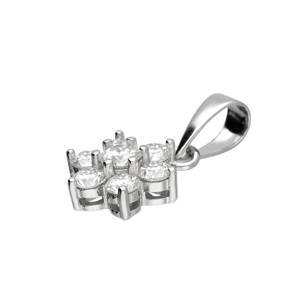 925 sterling silver pendant with rhodium plating, designed in a floral cluster featuring GH-colour moissanite stones, with a total diamond equivalent carat weight of 0.46. compact and vibrant, approximately 1.5cm , making it perfect for adding a touch of charm and elegance to any jewellery collection. Navya London includes a variety of designs from everlasting classic pieces to those with a modern day twist. Our 925 sterling silver allows for comfortable wear, especially for those with sensitive skin. Our silver products are created by applying traditional processes to contemporary designs inspiration from around the world, ensuring high quality craftsmanship and materials without losing the edge. A perfect gift for yourself or that special person in your life. Your jewel is presented in a beautiful gift box.