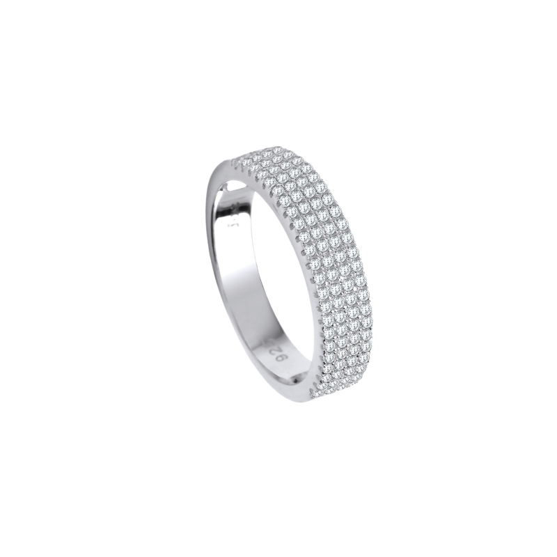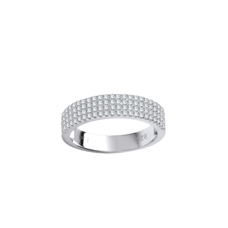 Micro pave eternity with cubic zirconia in 925 sterling silver ring. Navya London includes a variety of designs from everlasting classic pieces to those with a modern day twist. Our 925 sterling silver allows for comfortable wear, especially for those with sensitive skin. Our silver products are created by applying traditional processes to contemporary designs inspiration from around the world, ensuring high quality craftsmanship and materials without losing the edge. A perfect gift for yourself or that special person in your life. Your jewel is presented in a beautiful gift box.