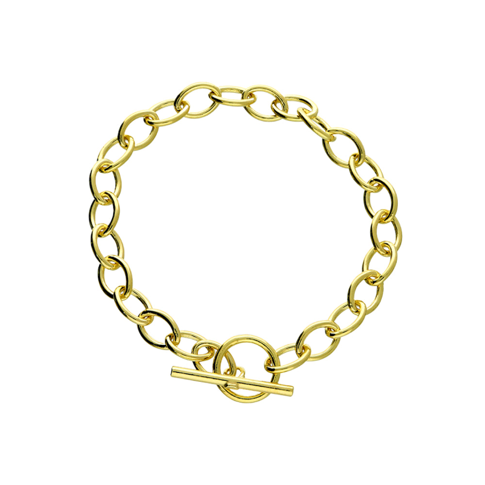 20cm long pretty rose gold plated open curb with feature T bar fastener. The T bar draws inspiration from traditional watch chains and is very on trend especially among Taylor Swift fans. Taylor has been spotted wearing T bar jewellery, which often symbolizes a blend of classic style with a modern edge. For retailers this blend of nostalgia and contemporary style adds appeal across age groups in 925 sterling silver bracelets, also comes in gold.