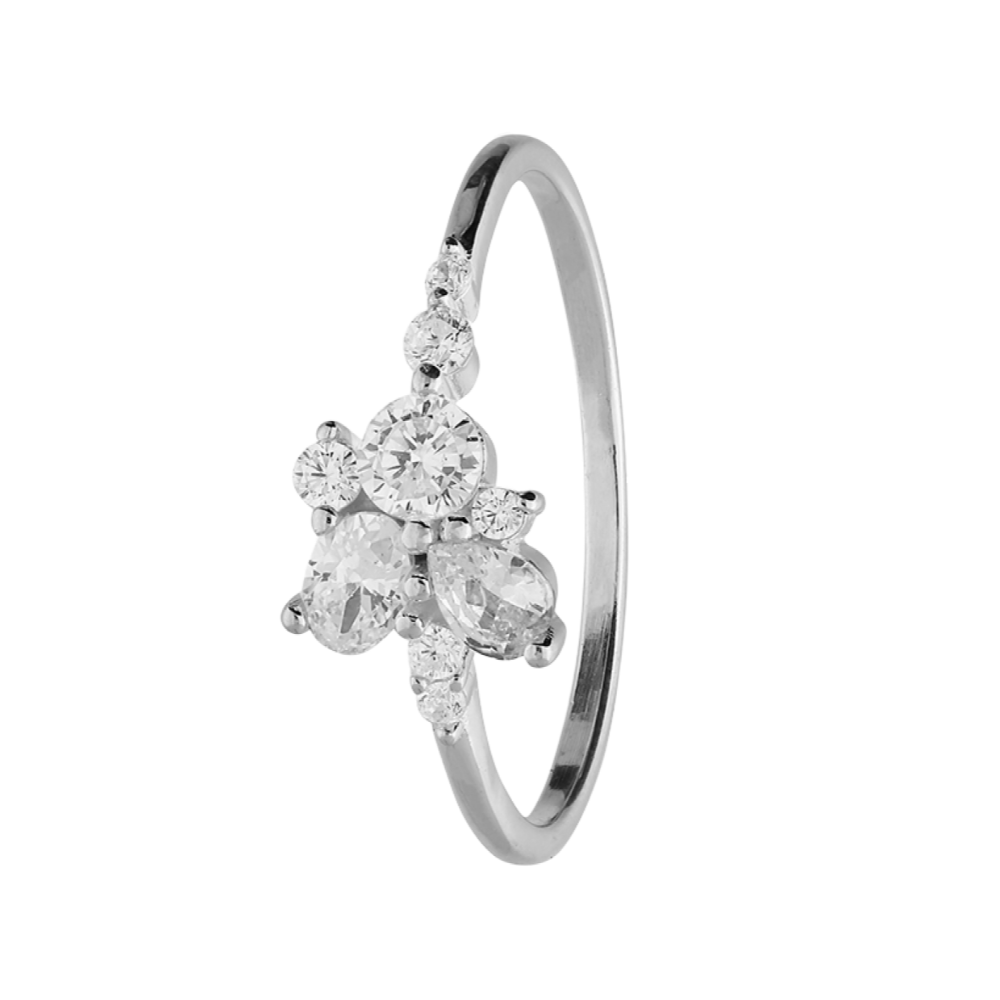 Abstract cubic zirconia flower in 925 sterling silver ring. Navya London includes a variety of designs from everlasting classic pieces to those with a modern day twist. Our 9ct gold allows for comfortable wear, especially for those with sensitive skin. Our gold products are created by applying traditional processes to contemporary designs inspiration from around the world, ensuring high quality craftsmanship and materials without losing the edge. A perfect gift for yourself or that special person in your life. Your jewel is presented in a beautiful gift box.