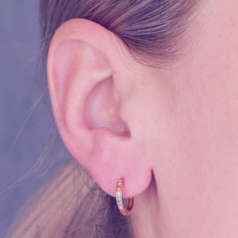 14mm big with yellow gold plated rainbow on huggie hinged hoop in 925 sterling silver earrings. Navya London includes a variety of designs from everlasting classic pieces to those with a modern day twist. Our 925 sterling silver allows for comfortable wear, especially for those with sensitive skin. Our silver products are created by applying traditional processes to contemporary designs inspiration from around the world, ensuring high quality craftsmanship and materials without losing the edge. A perfect gift for yourself or that special person in your life. Your jewel is presented in a beautiful gift box.