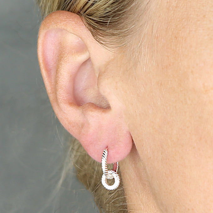 Small soft twist circle cubic zirconia charm on a larger soft twist hinged hoop in 925 sterling silver earrings. Navya London includes a variety of designs from everlasting classic pieces to those with a modern day twist. Our 925 sterling silver allows for comfortable wear, especially for those with sensitive skin. Our silver products are created by applying traditional processes to contemporary designs inspiration from around the world, ensuring high quality craftsmanship and materials without losing the edge. A perfect gift for yourself or that special person in your life. Your jewel is presented in a beautiful gift box.