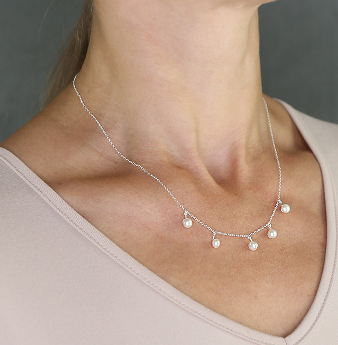 Five freshwater pearls on a chain in 925 sterling silver necklace. Navya London includes a variety of designs from everlasting classic pieces to those with a modern day twist. Our 925 sterling silver allows for comfortable wear, especially for those with sensitive skin. Our silver products are created by applying traditional processes to contemporary designs inspiration from around the world, ensuring high quality craftsmanship and materials without losing the edge. A perfect gift for yourself or that special person in your life. Your jewel is presented in a beautiful gift box.