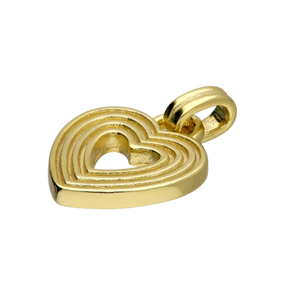 This yellow gold plated heart pendant features a layered open heart design that radiates timeless elegance and charm. The concentric heart outlines create a dimensional effect in 925 sterling silver pendant.