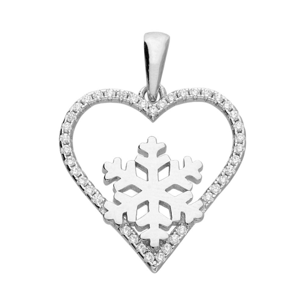 Snowflake in cubic zirconia outline heart in 925 sterling silver pendant. Navya London includes a variety of designs from everlasting classic pieces to those with a modern day twist. Our 925 sterling silver allows for comfortable wear, especially for those with sensitive skin. Our silver products are created by applying traditional processes to contemporary designs inspiration from around the world, ensuring high quality craftsmanship and materials without losing the edge. A perfect gift for yourself or that special person in your life. Your jewel is presented in a beautiful gift box.