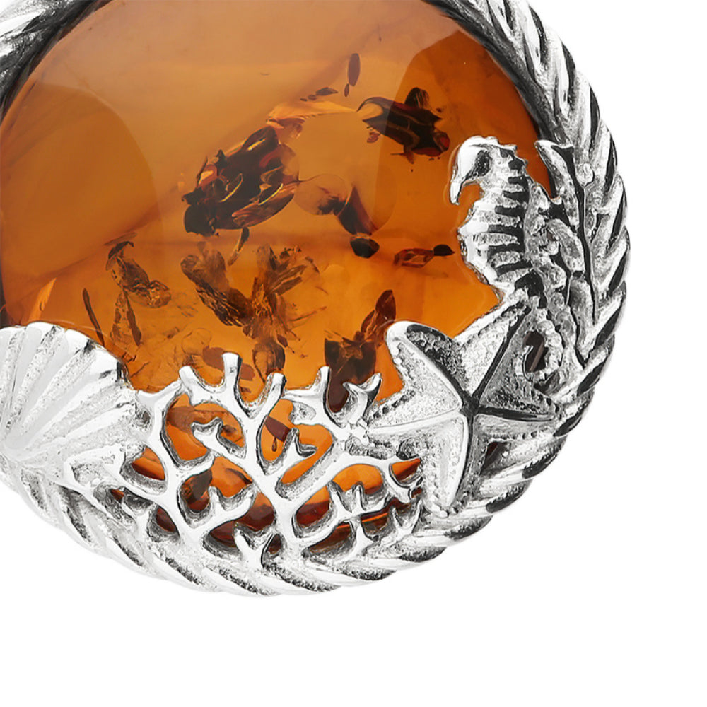 Under the sea cognac amber cabochon in 925 sterling silver pendant. Navya London includes a variety of designs from everlasting classic pieces to those with a modern day twist. Our 9ct, 925 sterling silver allows for comfortable wear, especially for those with sensitive skin. Our silver products are created by applying traditional processes to contemporary designs inspiration from around the world, ensuring high quality craftsmanship and materials without losing the edge. A perfect gift for yourself or that special person in your life. Your jewel is presented in a beautiful gift box.