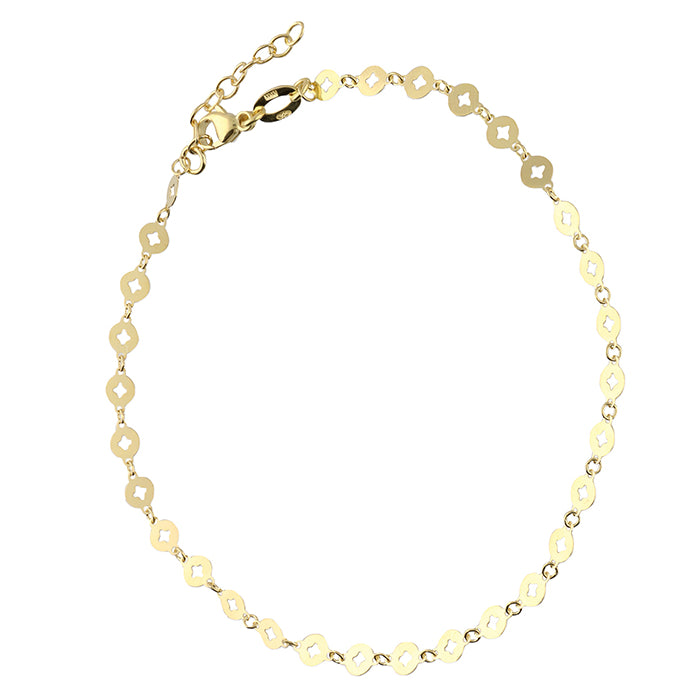 Extender yellow gold plated fancy cut out disc in 925 sterling silver anklet. Navya London includes a variety of designs from everlasting classic pieces to those with a modern day twist. Our 925 sterling silver allows for comfortable wear, especially for those with sensitive skin. Our silver products are created by applying traditional processes to contemporary designs inspiration from around the world, ensuring high quality craftsmanship and materials without losing the edge. A perfect gift for yourself or that special person in your life. Your jewel is presented in a beautiful gift box.