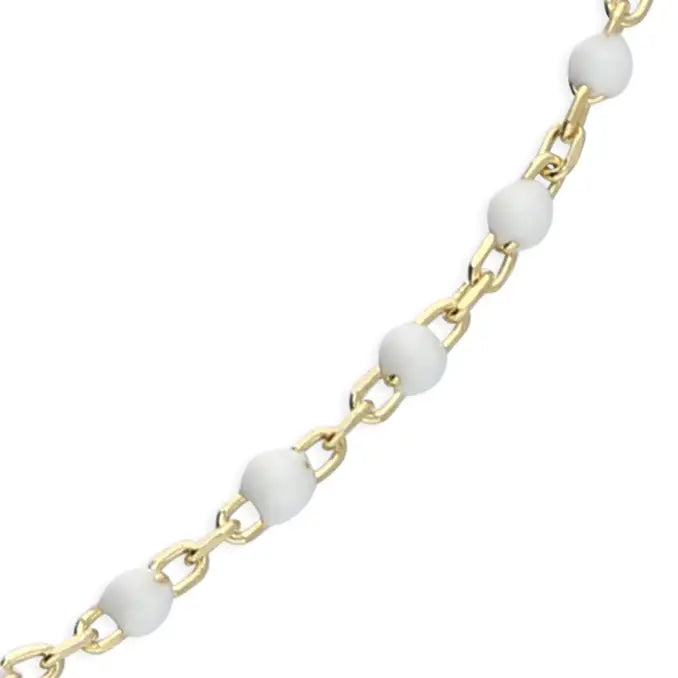 White Italian beads with yellow gold plated and 25cm extender in 925 sterling silver anklet. Navya London includes a variety of designs from everlasting classic pieces to those with a modern day twist. Our 925 sterling silver allows for comfortable wear, especially for those with sensitive skin. Our silver products are created by applying traditional processes to contemporary designs inspiration from around the world, ensuring high quality craftsmanship and materials without losing the edge. A perfect gift for yourself or that special person in your life. Your jewel is presented in a beautiful gift box.