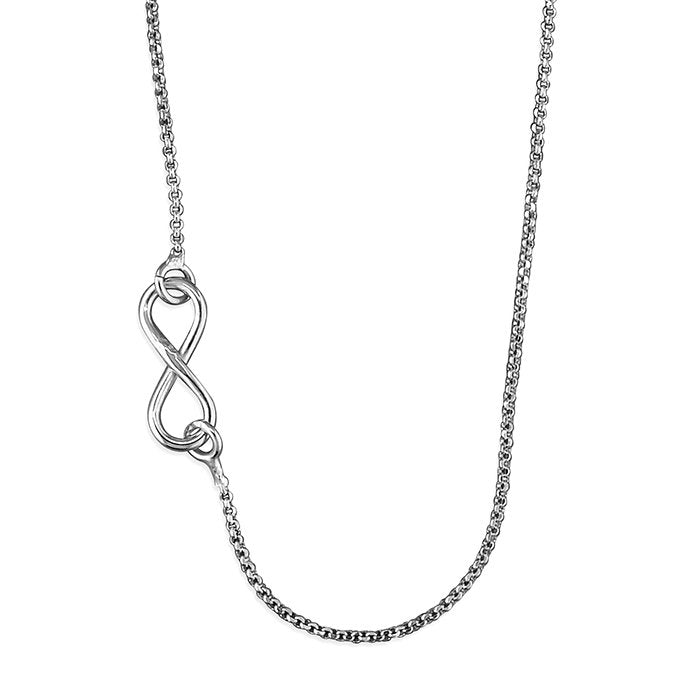39-45cm sterling silver necklace with off centre infinity. Navya London includes a variety of designs from everlasting classic pieces to those with a modern day twist. Our 925 sterling silver allows for comfortable wear, especially for those with sensitive skin. Our silver products are created by applying traditional processes to contemporary designs inspiration from around the world, ensuring high quality craftsmanship and materials without losing the edge. A perfect gift for yourself or that special person in your life. Your jewel is presented in a beautiful gift box. Weight: Approx. 3.35gm