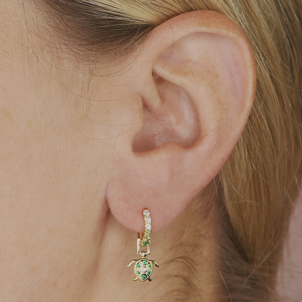 Yellow gold plated in 925 sterling silver single hinged huggie featuring vivid green and white cubic zirconia with a turtle charm. Great for stacking or asymmetric styling. Navya London includes a variety of designs from everlasting classic pieces to those with a modern day twist. Our 925 sterling silver allows for comfortable wear, especially for those with sensitive skin. Our silver products are created by applying traditional processes to contemporary designs inspiration from around the world, ensuring high quality craftsmanship and materials without losing the edge. A perfect gift for yourself or that special person in your life. Your jewel is presented in a beautiful gift box.