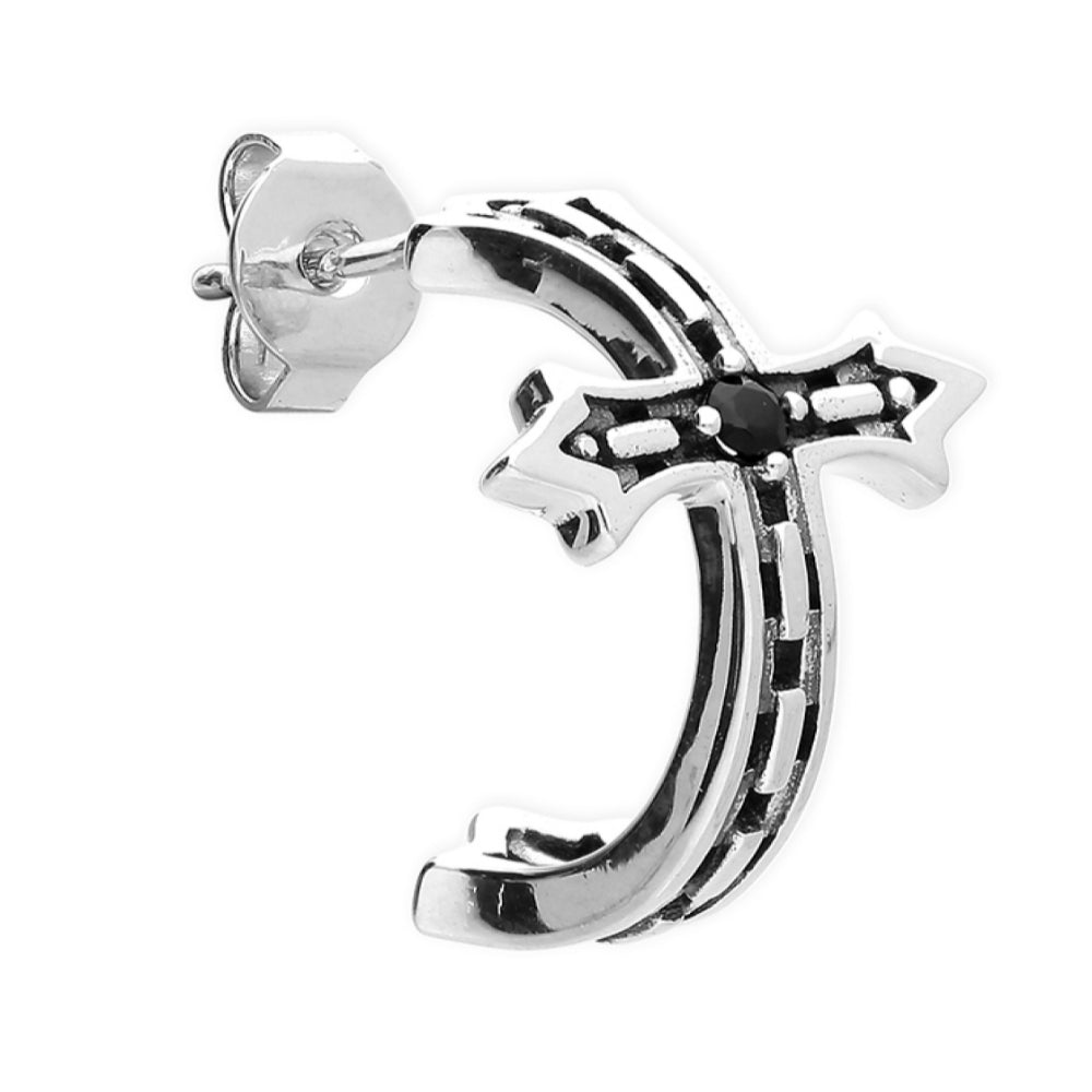 Single unisex stud earring, gothic black cubic zirconia half hoop cross stud in 925 sterling silver earring. Navya London isn’t just jewellery it’s a statement. From timeless classics to modern silhouettes with an edge, our pieces are designed for those who don’t follow trends they set them.
